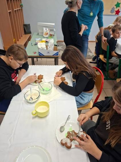 W dniu dzisiejszym tj 10.12.2025 uczniowie uczęszczający na zajęcia rewalidacyjne pod czujnym okiem Zespołu Nauczycieli d/s Rewalidacji, tradycyjnie już , także i tym roku szkolnym ozdabiały pierniczki- kolorowym lukrem, koraliczkami ,posypkami.Pisały nawet na pierniczkach kolorowymi barwnikami -literki, wyrazy. Pierniczki okazały się małymi dziełami sztuki cukierniczej. Po pięknej dekoracji pierniczków, był czas na ich konsumpcję .Pierniczki były pyszne i mocno słodkie.